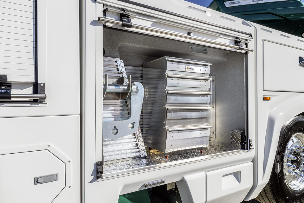 Et parce que l’efficacité se joue aussi dans les détails, NRC a revu ses solutions de rangement avec un coffre à outils latéral gauche 40 % plus grand et entièrement personnalisable selon les besoins de chaque opérateur.